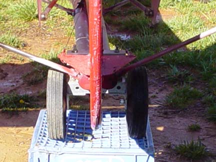 is made of 2 lawnmower wheels and 2 pieces of scrap square tube. Use 2