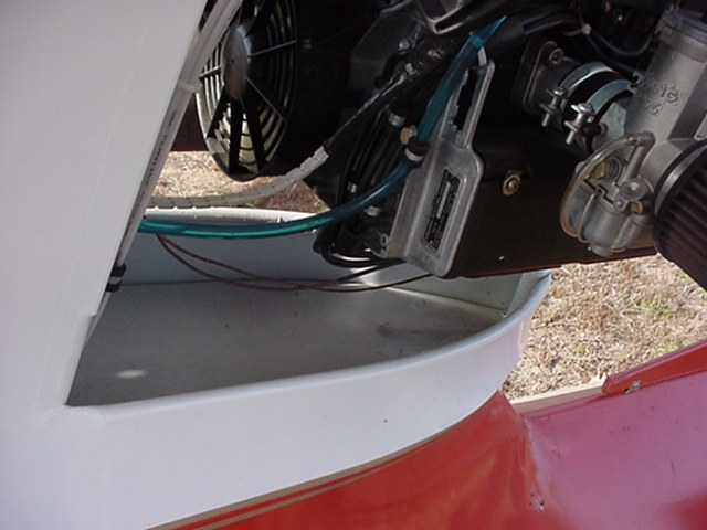 lower rib below engine. Allows room to change plugs and heater tube, but